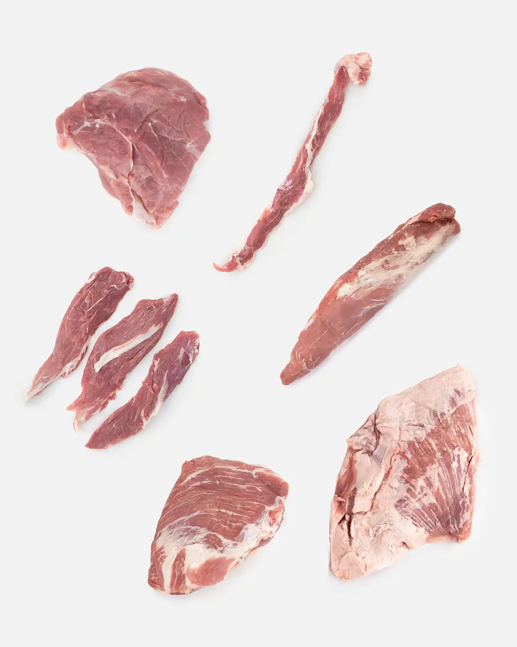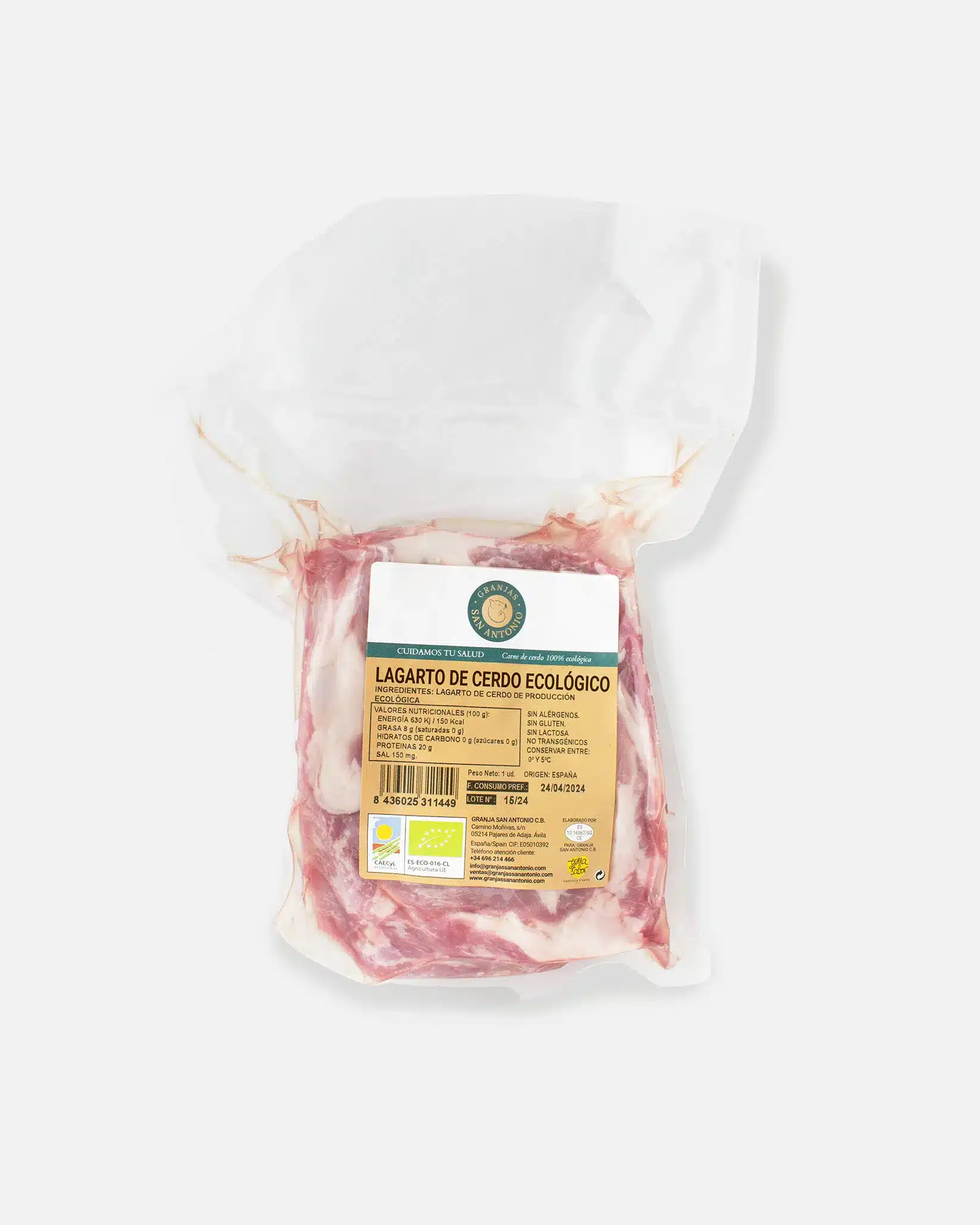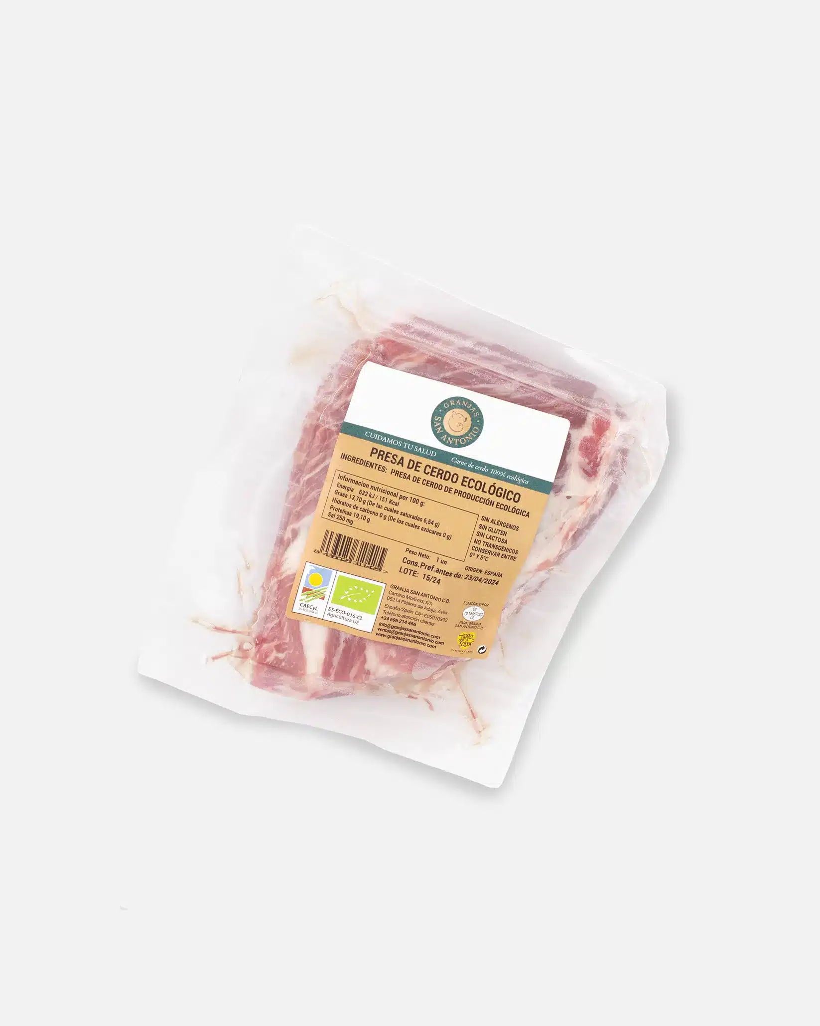 | Producción ecológica | 1 Abanico (500 gr.), 1 Lagarto (500 gr.), 1 Secreto (500 gr.), 1 Presa (500 gr.), 1 Pluma (500 gr.) y 1 Solomillo (500 gr.) de cerdo ecológico. |