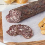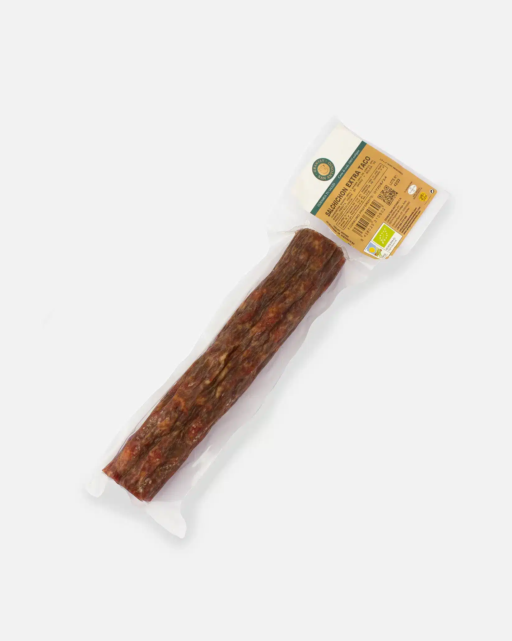 Salchichón Extra Taco 100% Ecológico elaborado con magro y grasa de cerdo, pimienta molida y en grano de producción ecológica, y sal marina. Este producto es adecuado para personas celíacas y diabéticas, ya que es libre de gluten, azúcar y lactosa.»